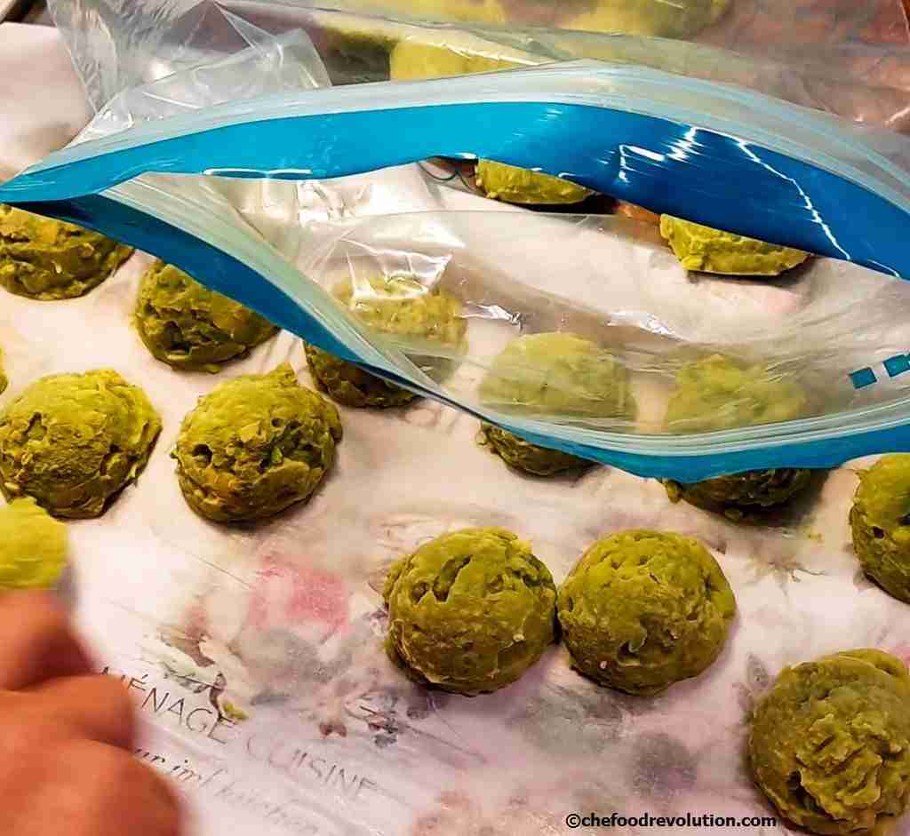 Step 4. Circa 1 ora di raffreddamento è sufficiente per creare le monodosi di avocado congelate, da poter trasferire e chiudere velocemente nel sacchetto riutilizzabile. Se il sacchetto è ben sigillato e la temperatura rimane costante, le palline di avocado mantengono la loro bontà anche per 5-6 mesi.